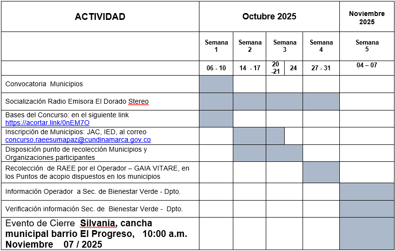 Cada municipio, coordinará con las organizaciones participantes y dispondrá de un punto fijo de recolección, donde la comunidad a través de las Juntas de Acción Comunal –JAC e instituciones educativas departamentales IED, pueden depositar sus residuos eléctricos y electrónicos - RAEE; hasta máximo 24 de octubre de 2025.